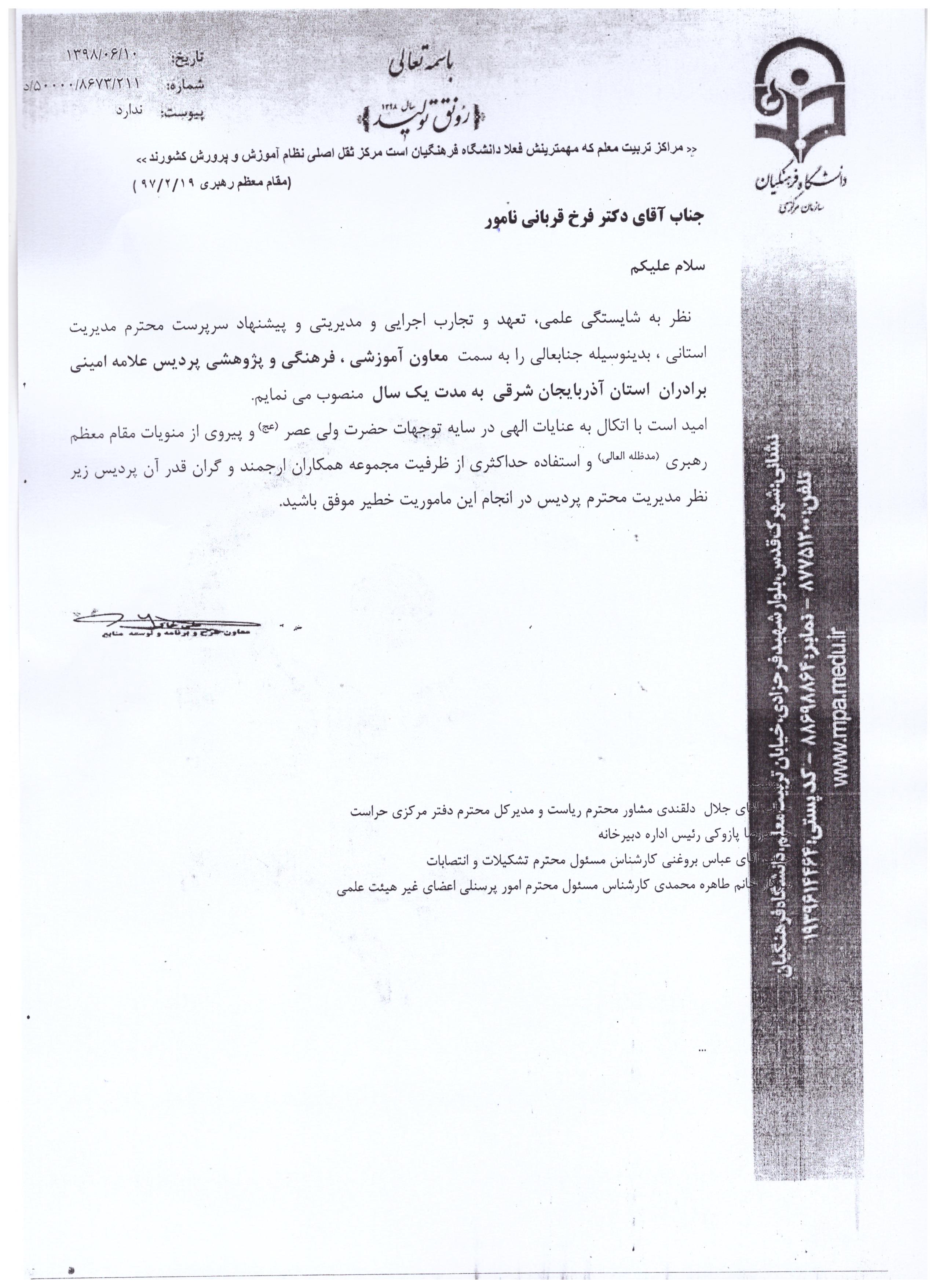 طی حکمی از طرف معاون طرح،برنامه و توسعه منابع دانشگاه فرهنگیان صورت پذیرفت