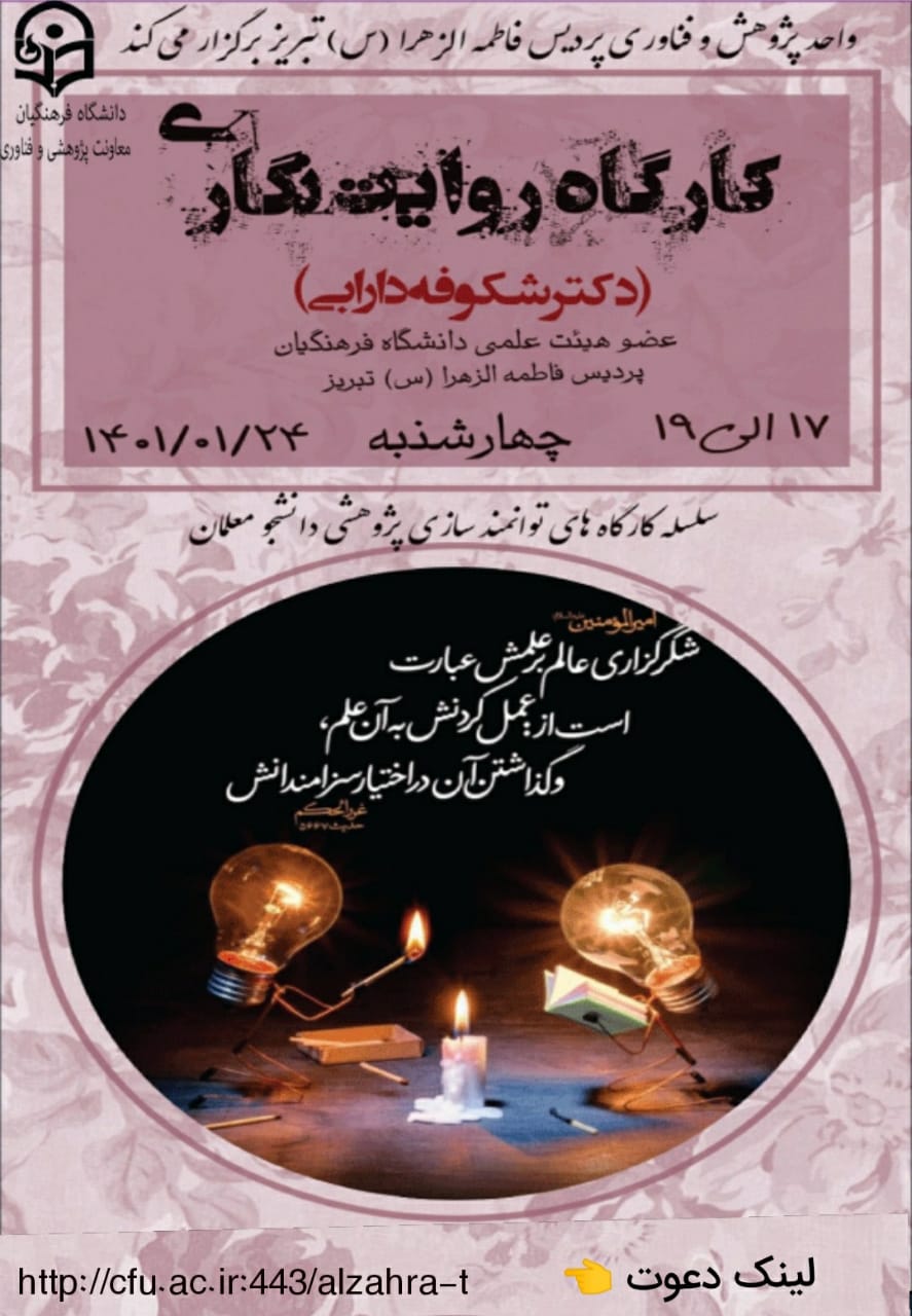 در راستای توانمندسازی پژوهشی دانشجومعلمان کارگاه روایتنگاری روز چهارشنبه مورخ ۲۴ فروردین ماه سال ۱۴۰۱ ساعت ۱۷ الی ۱۹ عصر از سامانه یادگیری الکترونیکی دانشگاه فرهنگیان(محیط مجازی استان آذربایجان شرقی) با تدریس خانم دکتر شکوفه دارابی برگزار شد و فایل صوتی این کارگاه از طریق کانالهای پژوهش در اختیار دانشجویان قرار گرفت.