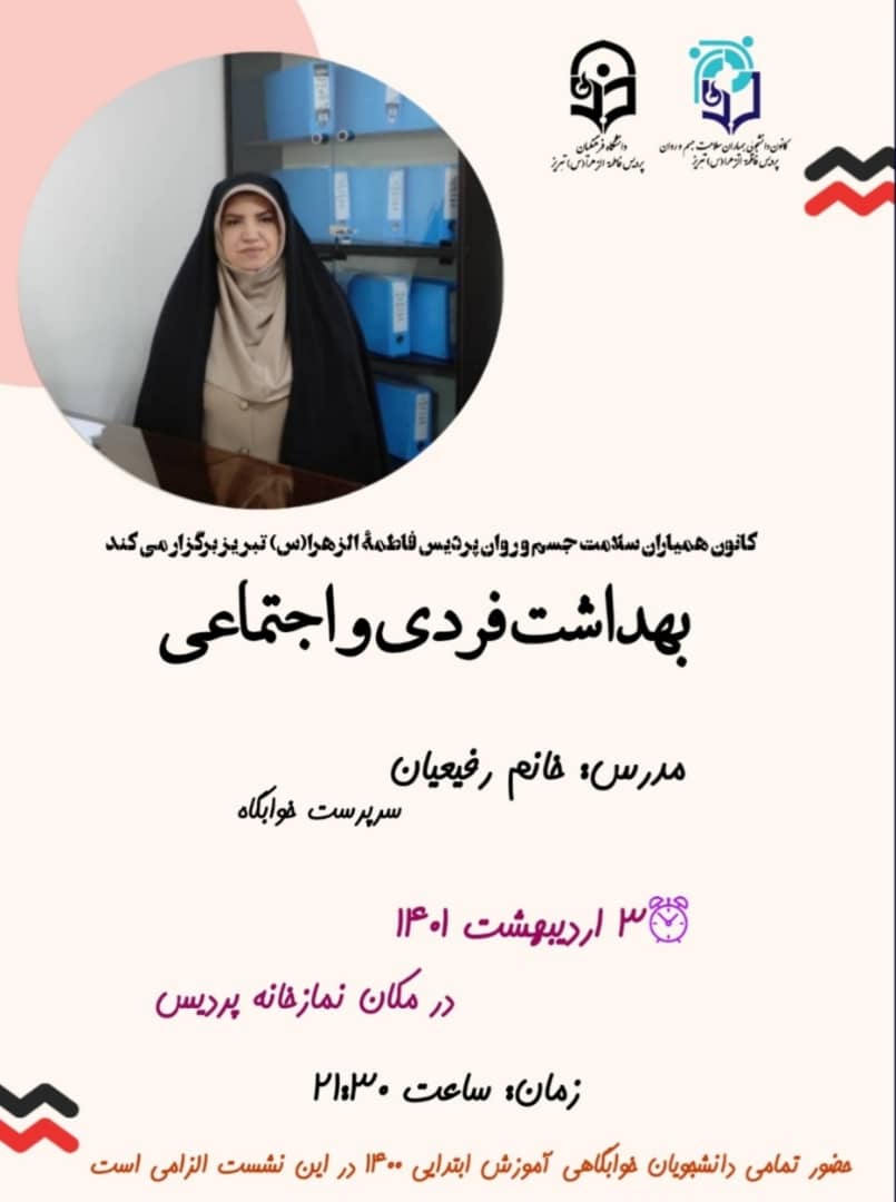 به گزارش روابط عمومی پردیس، نشست تخصصی با موضوع "بهداشت فردی و اجتماعی" در تاریخ ۳ اردیبهشت ۱۴۰۱ به مدرسی خانم رفیعیان با حضور جمعی از دانشجویان رشته ابتدایی ورودی 1400 در نمازخانه پردیس برگزار شد.