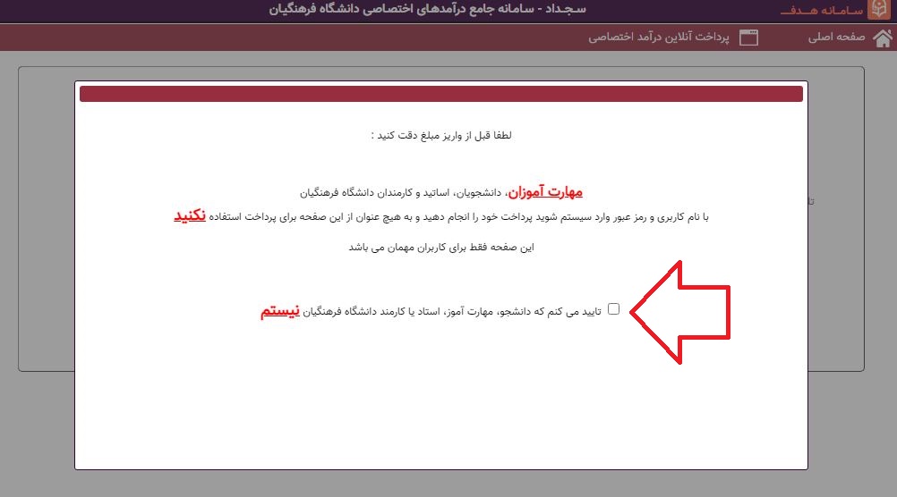 خواهشمند است جهت رزرو نهار از طریق سامانه هدف هوشمند سازی دانشگاه فرهنگیان (سجداد) اقدام و نسبت به اخذ فیش از امور مالی دانشگاه اقدام نمایند. (هر وعده 25000 تومان)