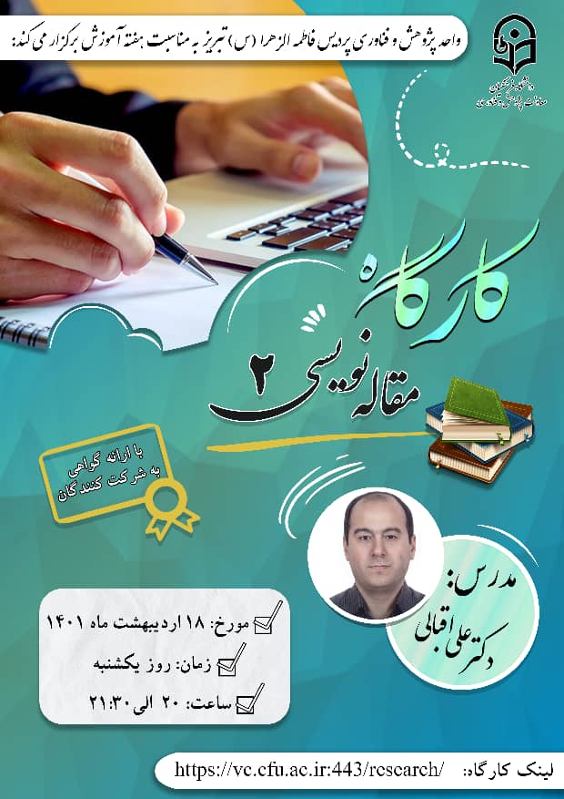 کارگاه مقاله نویسی، روز یکشنبه مورخه ۱۸ اردیبهشت ماه ۱۴۰۱ از ساعت ۲۰ الی ۲۱:۳۰ در سامانه یادگیری الکترونیکی دانشگاه فرهنگیان (محیط مجازی استان آذربایجان شرقی) با حضور ۴۹ نفر از دانشجویان پردیس فاطمه الزهرا (س)، با سخنرانی دکتر علی اقبالی برگزار شد که جلسه اول این کارگاه قبل از عید برگزار شده بود.