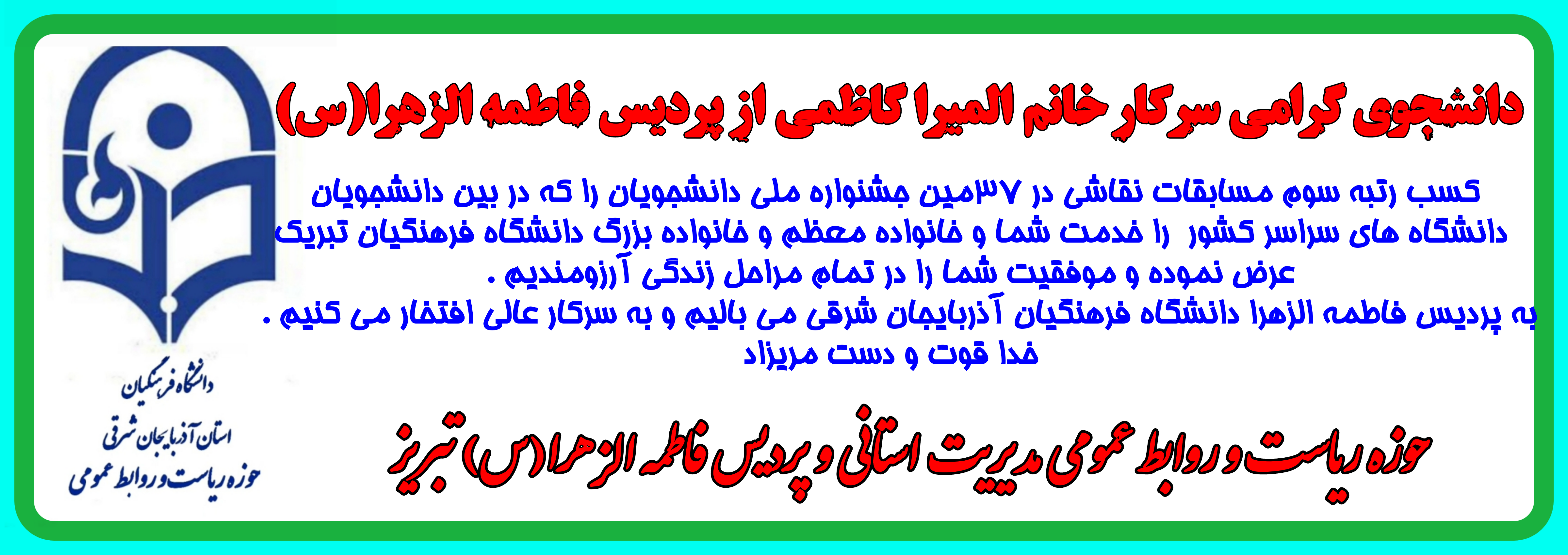 حوزه ریاست و روابط عمومی مدیریت استانی و پردیس فاطمه الزهرا نیز ضمن تبریک به این دانشجوی عزیز و خانواده بزرگ فرهنگیان آذربایجان شرقی آرزوی توفیق ایشان را در تمام مراحل زندگی آرزومند است.