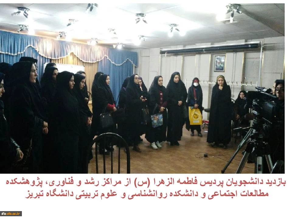 به مناسبت هفته پژوهش، جمعی از دانشجویان پردیس فاطمه الزهرا (س) از مراکز رشد و فناوری، پژوهشکده مطالعات اجتماعی و دانشکده روانشناسی و علوم تربیتی دانشگاه تبریز بازدید نمودند. در این بازدید علمی، دانشجویان ضمن شرکت در کلاس روانشناسی تربیتی این دانشکده، از قسمت های مختلف آن از جمله آزمایشگاه تکنولوژِی و کتابخانه بازدید به عمل آوردند.