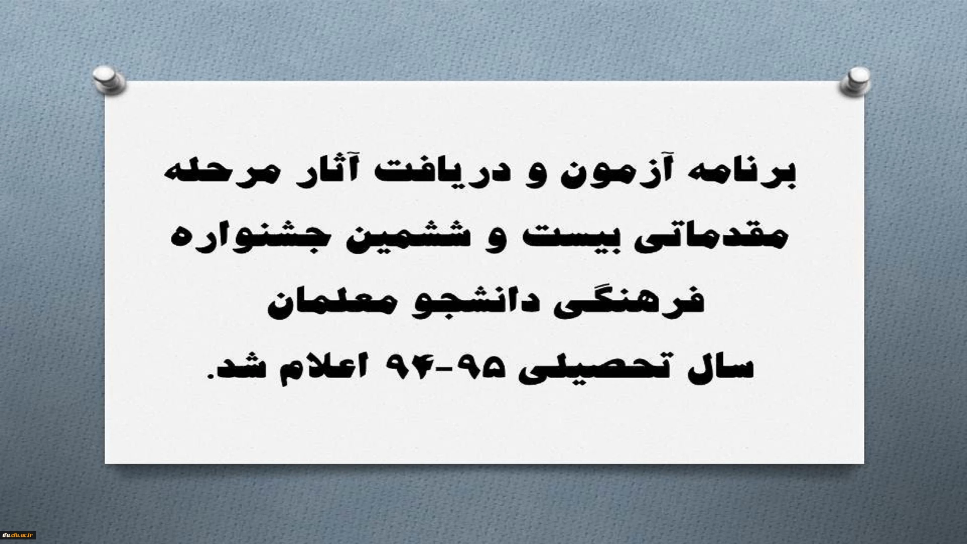 برنامه آزمون و دریافت آثار مرحله مقدماتی بیست و ششمین جشنواره فرهنگی دانشجو معلمان در سال تحصیلی 95-94 اعلام شد. 2