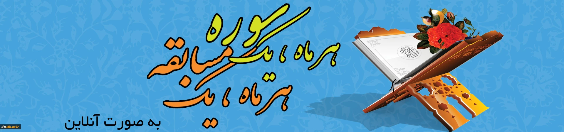 مسابقه شماره 2 ، هر ماه یک سوره، یک مسابقه مسابقه اردیبهشت ماه، از سوره اسراء تا آیه 50 این سوره خواهد بود. علاقمندان جهت ثبت نام و دریافت کد ثبت نام (به صورت ماهانه کد جدید)به کانون قرآن و عترت و یا اتاق امور فرهنگی پردیس مراجعه نمایند. زمان آزمون ای