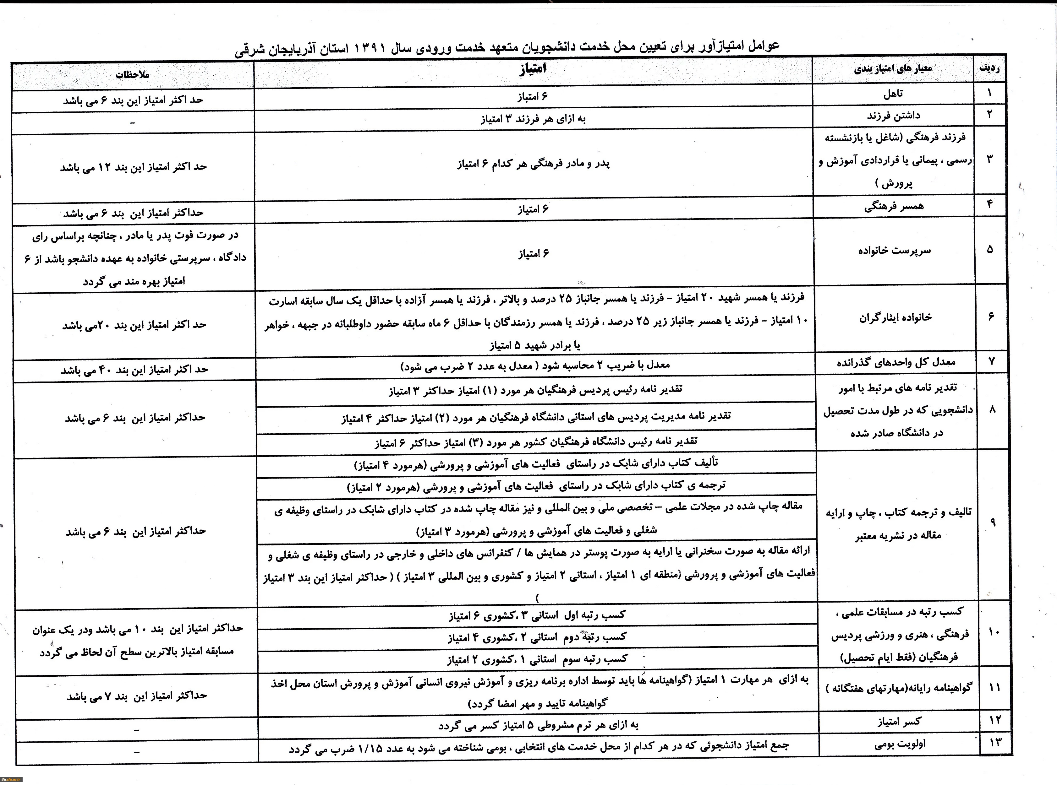امتیاز دهید : جدول تعیین امتیازات محل خدمت دانشجویان ورودی سال 91 اعلام شد. 4 دوشنبه 24 خرداد 1395 ساعت 9:00