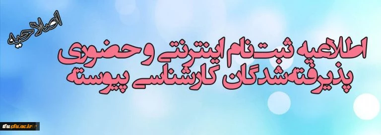 امتیاز دهید : اصلاحیه اطلاعیه ثبت نام اینترنتی و حضوری پذیرفته شدگان کارشناسی پیوسته 6 سهشنبه 6 مهر 1395 ساعت 10:11
