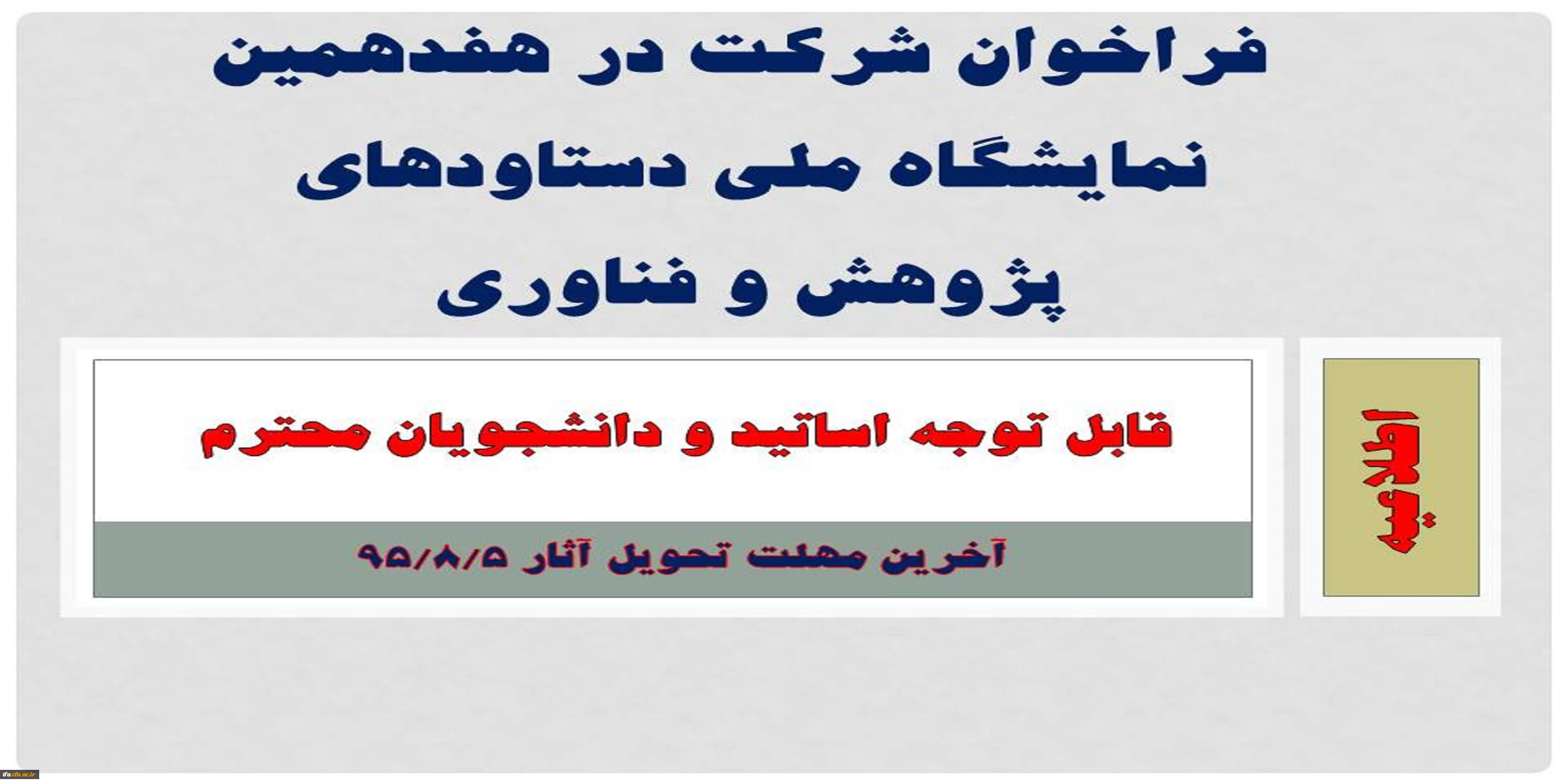 امتیاز دهید : فراخوان شرکت در هفدهمین نمایشگاه ملی دستاودهای پژوهش و فناوری 2 یکشنبه 2 آبان 1395 ساعت 10:11