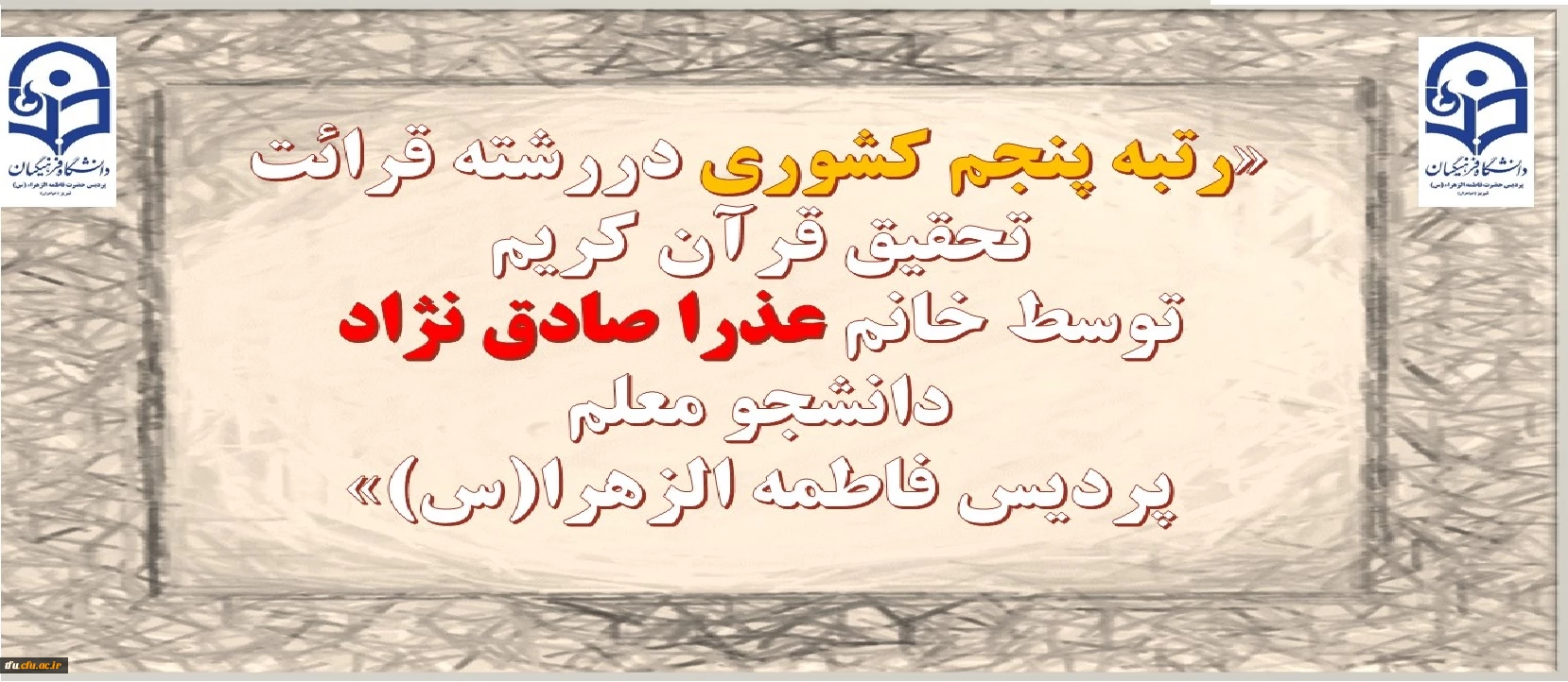 در مسابقات کشوریِ ۲۹اُمین جشنواره فرهنگی _ اجتماعی دانشگاه فرهنگیاندر بخش فعالیت های قرآنی (آوایی): رتبه پنجم کشوری دررشته قرائت تحقیق قرآن کریم توسط خانم عذرا صادق نژاد 2