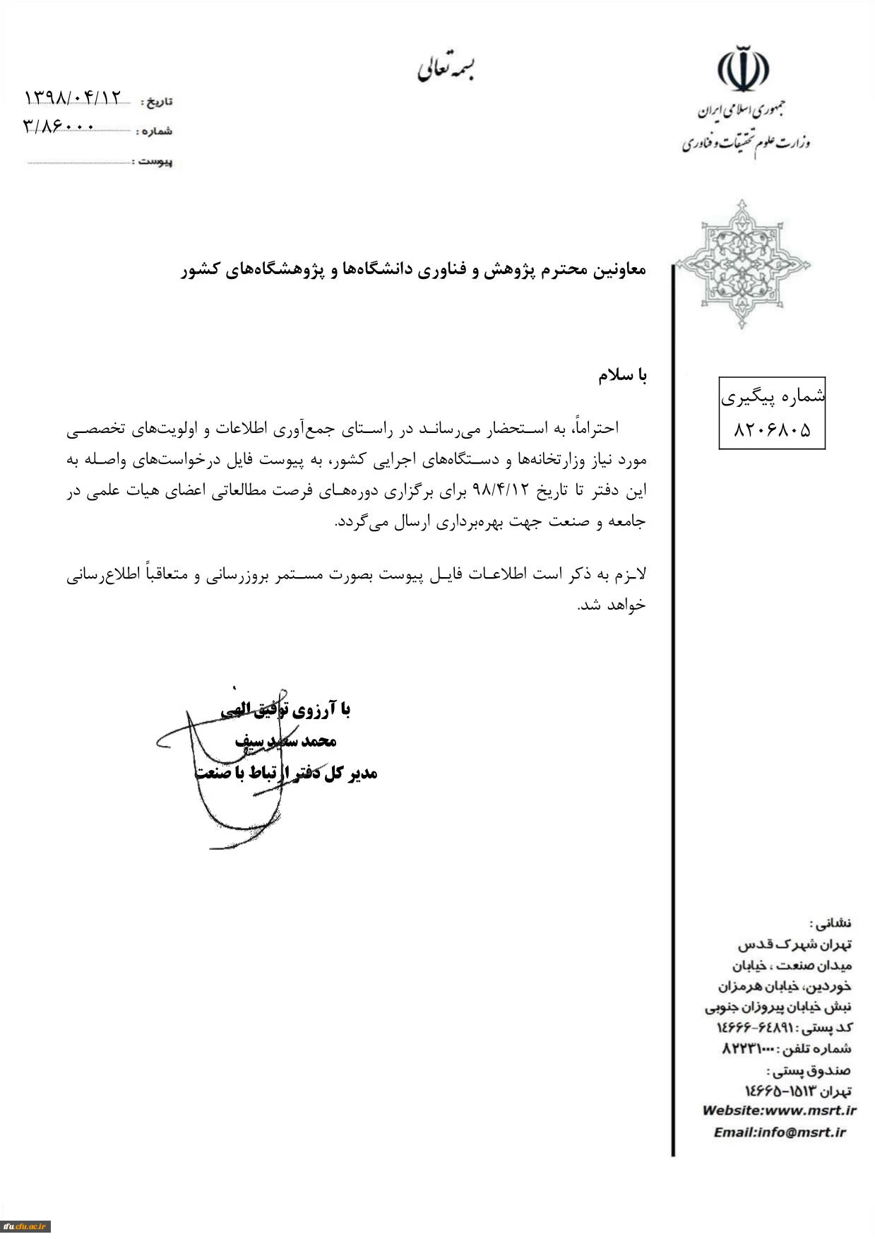 امتیاز دهید : فراخوان مربوط به دوره های فرصت مطالعاتی اعضای هیئت علمی در جامعه و صنعت 2 یکشنبه 13 مرداد 1398 ساعت 14:40