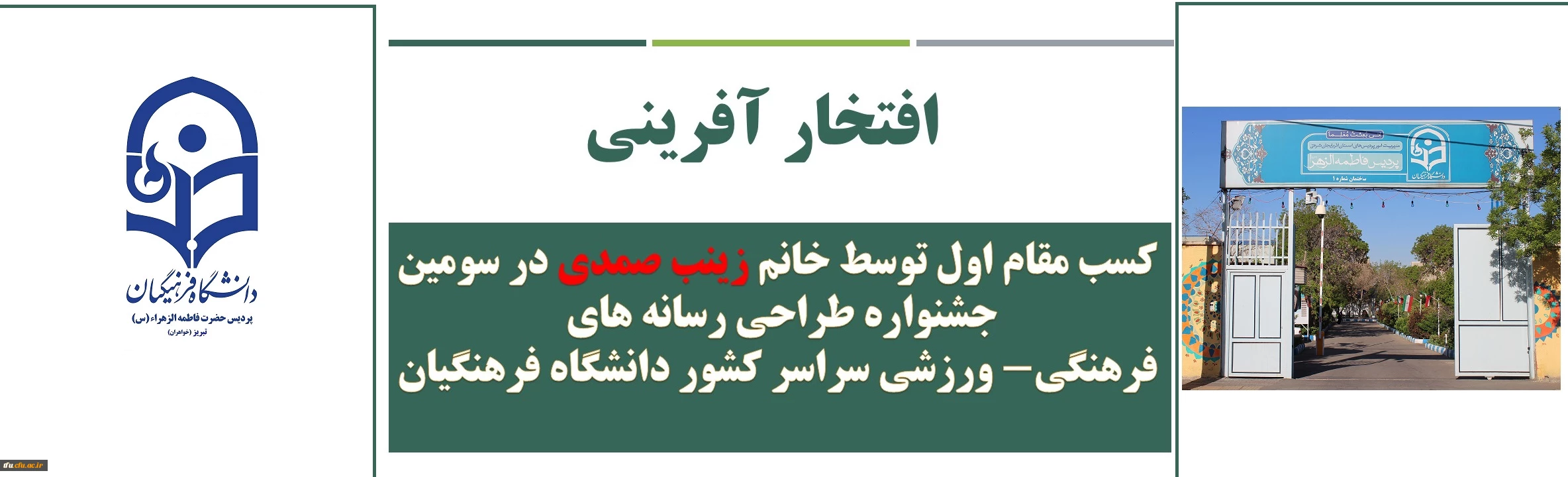 کسب مقام اول توسط خانم زینب صمدی در سومین جشنواره طراحی رسانه های فرهنگی- ورزشی سراسر کشور دانشگاه فرهنگیان 2