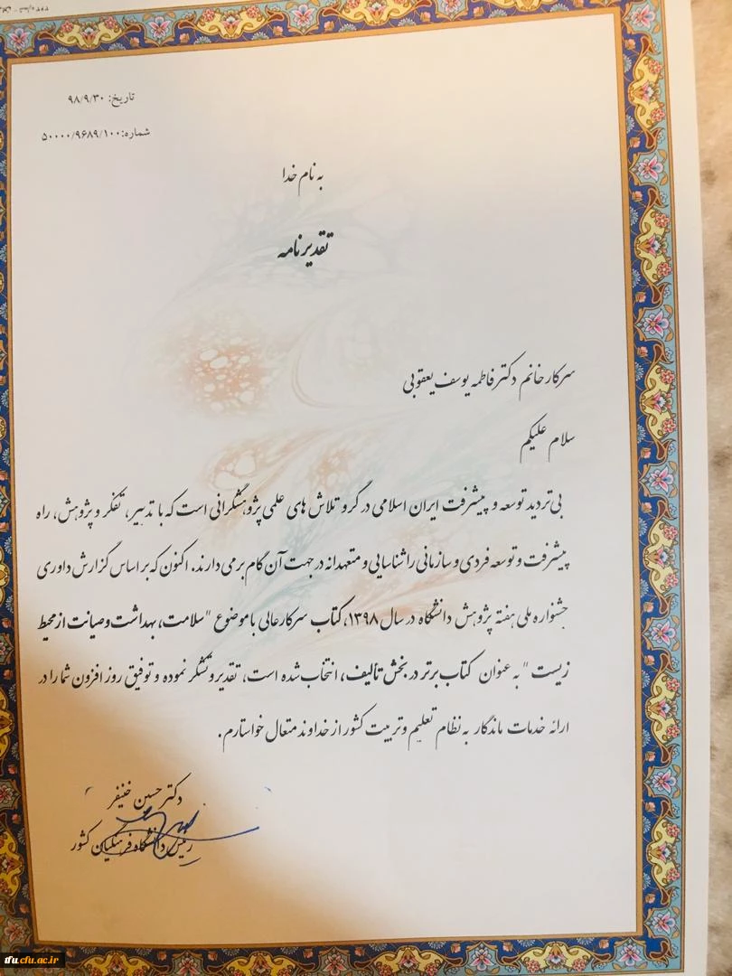 کسب رتبه اول تألیف کتاب توسط سرکار خانم دکتر فاطمه یوسف یعقوبی در جشنواره هفته پژوهش کشور 3