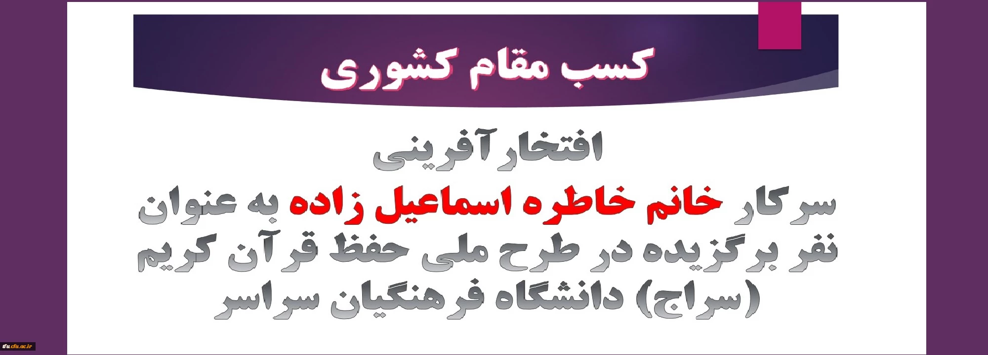 افتخارآفرینی سرکار خانم خاطره اسماعیل زاده به عنوان نفر برگزیده در طرح ملی حفظ قرآن کریم (سراج) دانشگاه فرهنگیان سراسر 2