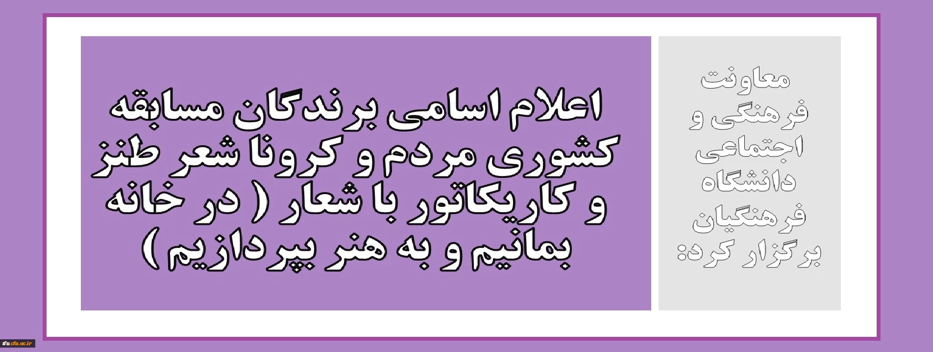 اعلام اسامی برندگان مسابقه کشوری مردم و کرونا شعر طنز و کاریکاتور با شعار ( در خانه بمانیم و به هنر بپردازیم ) 2