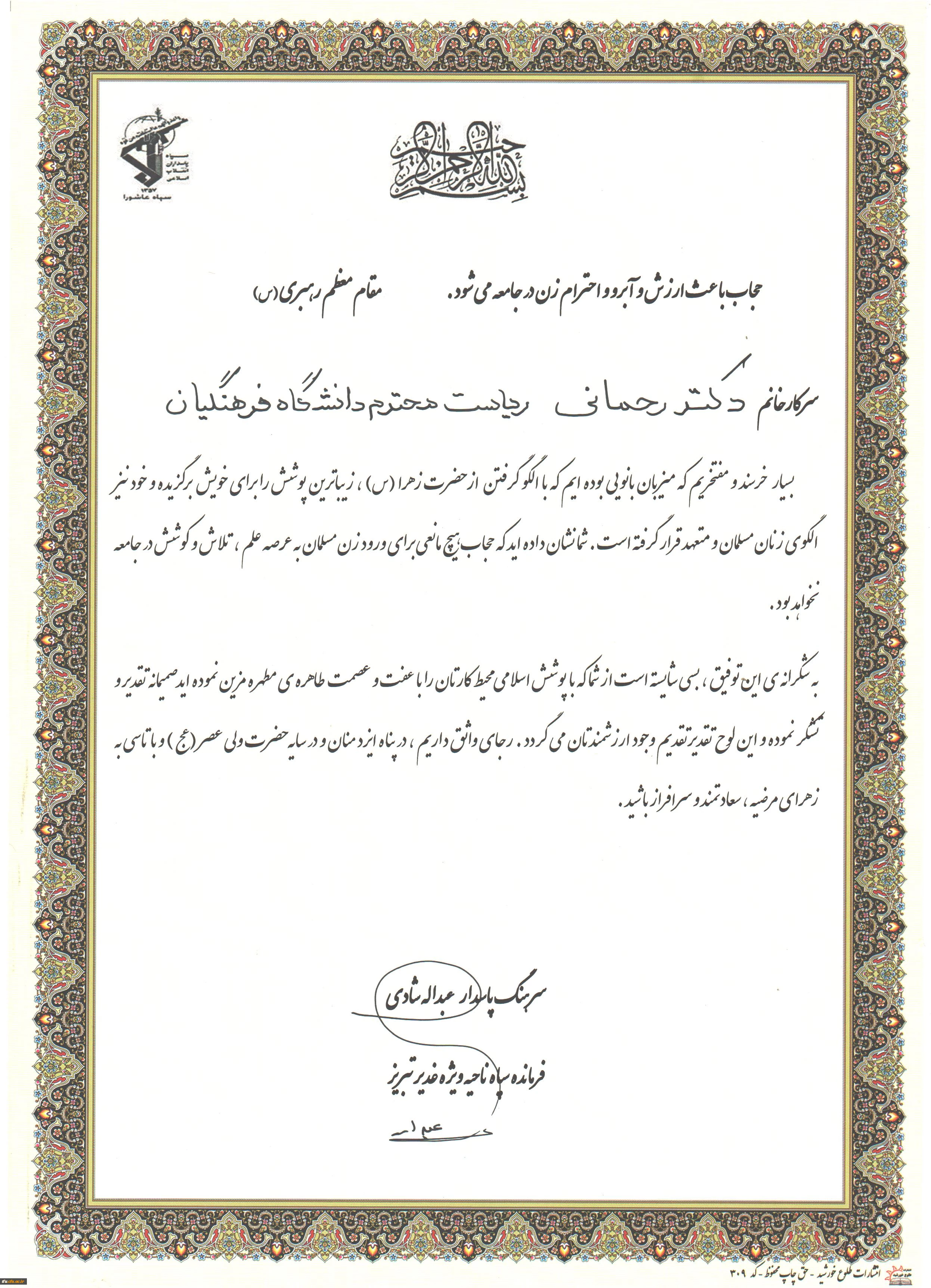 تقدیر از ریاست محترم پردیس فاطمه الزهرا (س) در جلسه ستاد مردمی عفاف و حجاب استان 3