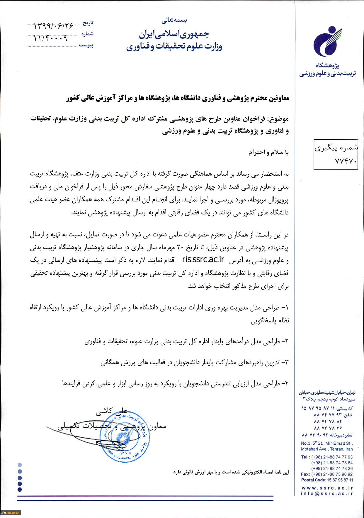 فراخوان عناوین پژوهشی مشترک اداره کل تربیت بدنی وزارت علوم و پژوهشگاه علوم ورزشی