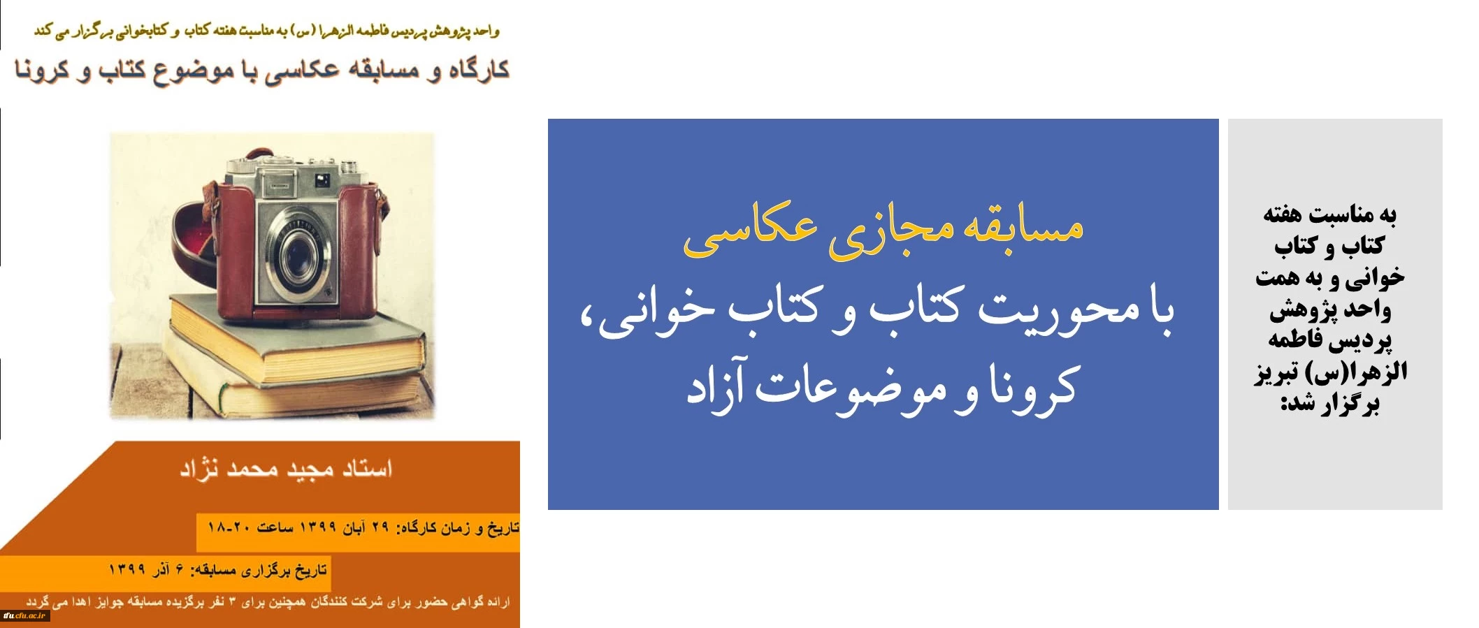 امتیاز دهید : مسابقه مجازی عکاسی با محوریت کتاب و کتاب خوانی، کرونا و موضوعات آزاد 2 پنجشنبه 13 آذر 1399 ساعت 12:15