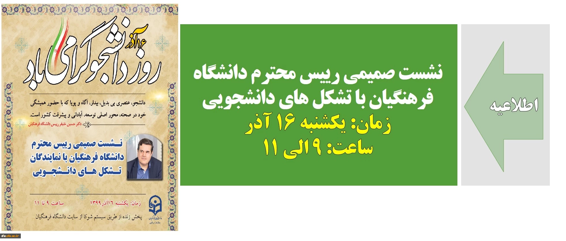 امتیاز دهید : نشست صمیمی رییس محترم دانشگاه فرهنگیان با تشکل های دانشجویی 2 یکشنبه 16 آذر 1399 ساعت 8:46