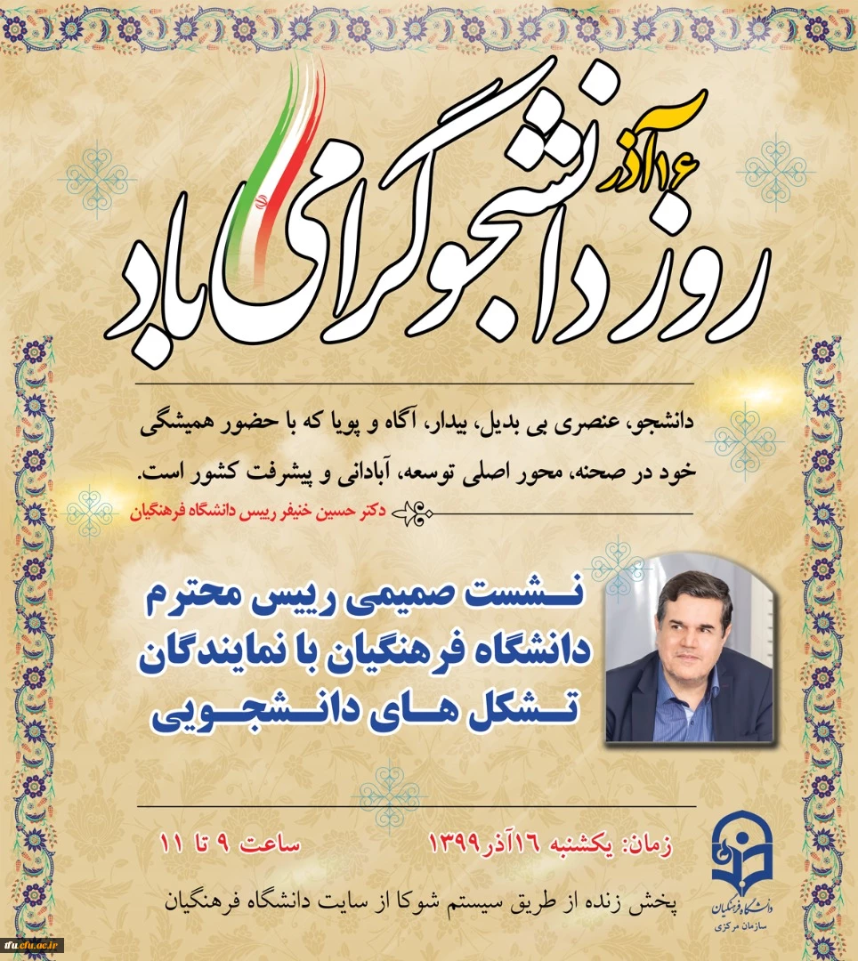 امتیاز دهید : نشست صمیمی رییس محترم دانشگاه فرهنگیان با تشکل های دانشجویی 3 یکشنبه 16 آذر 1399 ساعت 8:46