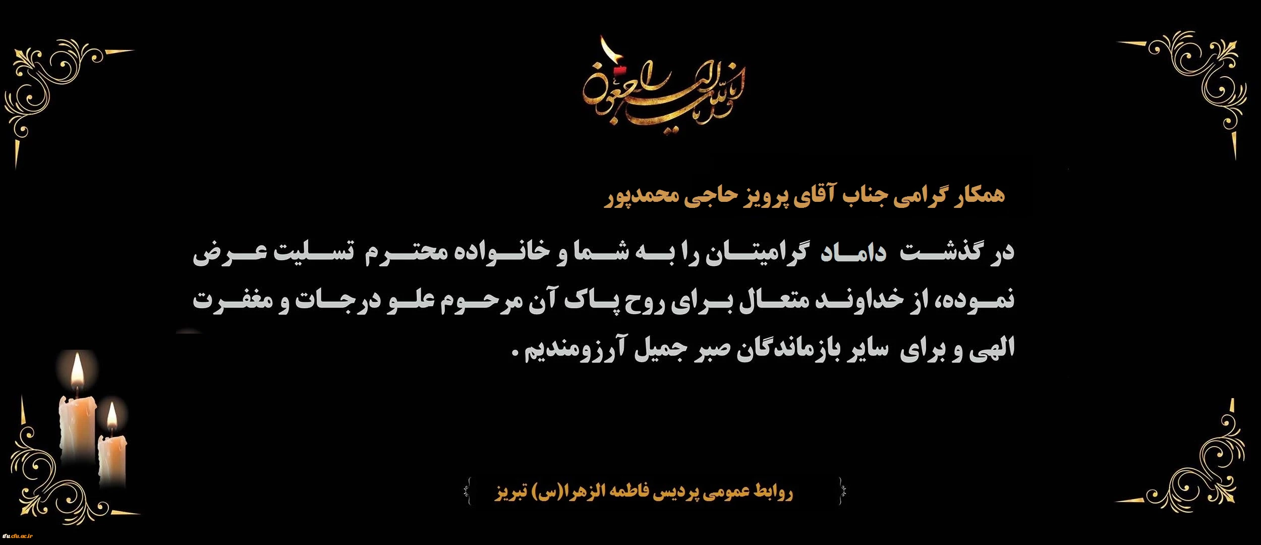 امتیاز دهید : پیام تسلیت درگذشت داماد گرامی همکار محترم جناب آقای پرویز حاجی محمدپور 2 یکشنبه 5 بهمن 1399 ساعت 10:43
