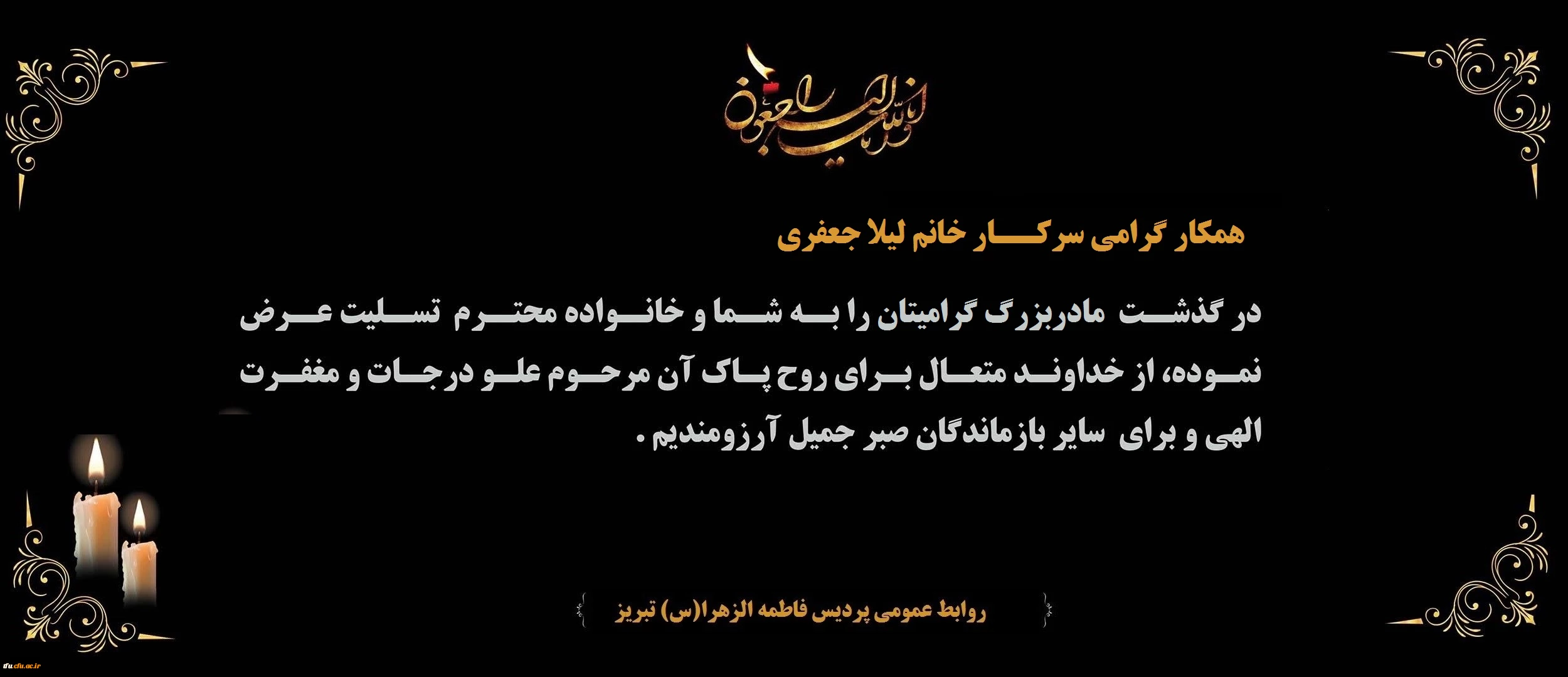 امتیاز دهید : پیام تسلیت درگذشت مادربزرگ گرامی همکار محترم سرکار خانم لیلا جعفری 2 دوشنبه 6 بهمن 1399 ساعت 8:43