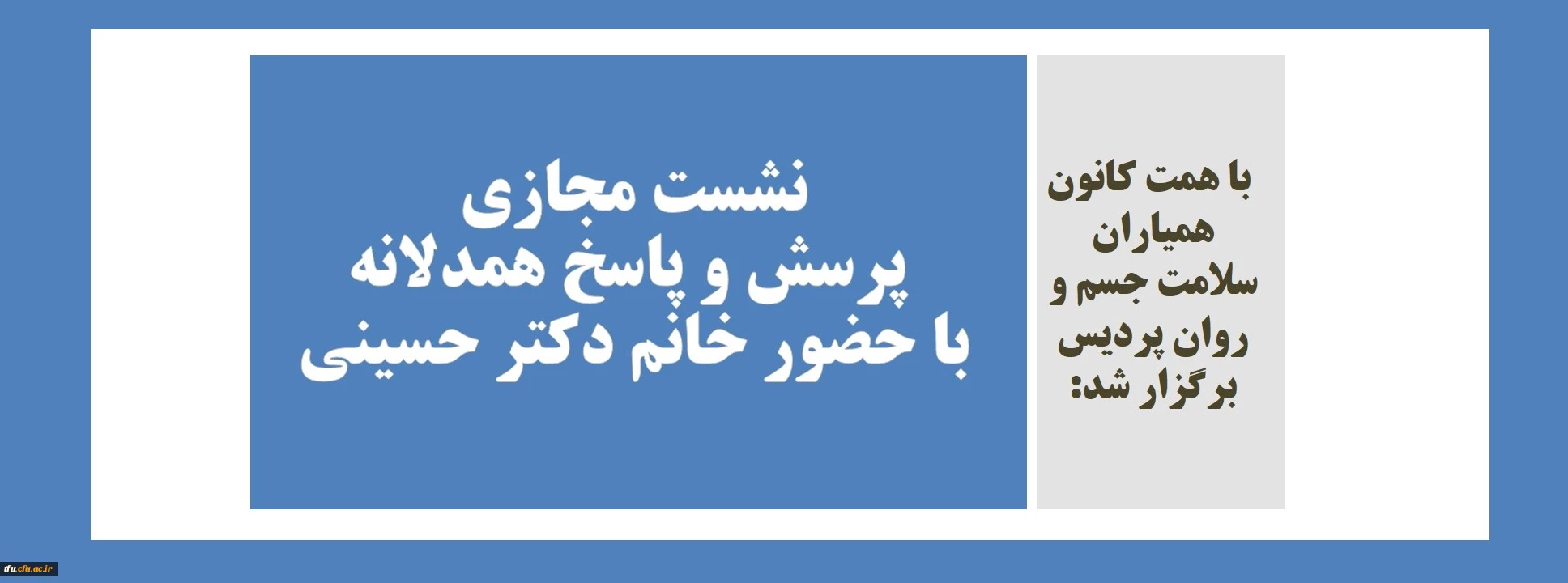 امتیاز دهید : نشست مجازی پرسش و پاسخ همدلانه با حضور خانم دکتر حسینی 3 دوشنبه 27 بهمن 1399 ساعت 12:14