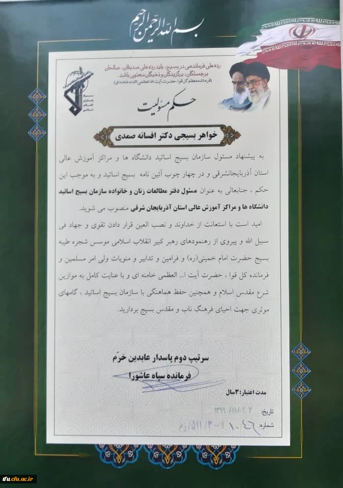 انتصاب سرکار خانم دکتر افسانه صمدی به سمت مسئول مطالعات زنان بسیج اساتید آذربایجان شرقی 3