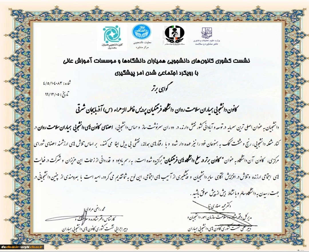 کسب رتبه دوم کانون دانشجویی همیاران سلامت پردیس فاطمه الزهرا(س) تبریز در دانشگاه فرهنگیان کشور 2