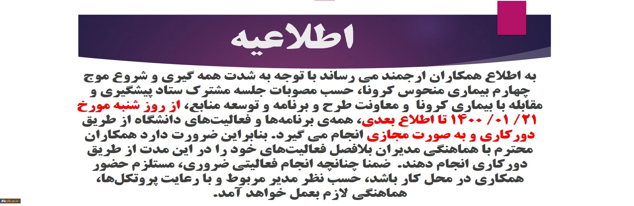 نحوه فعالیت و حضور همکاران از روز شنبه 21 فروردین 1400 2