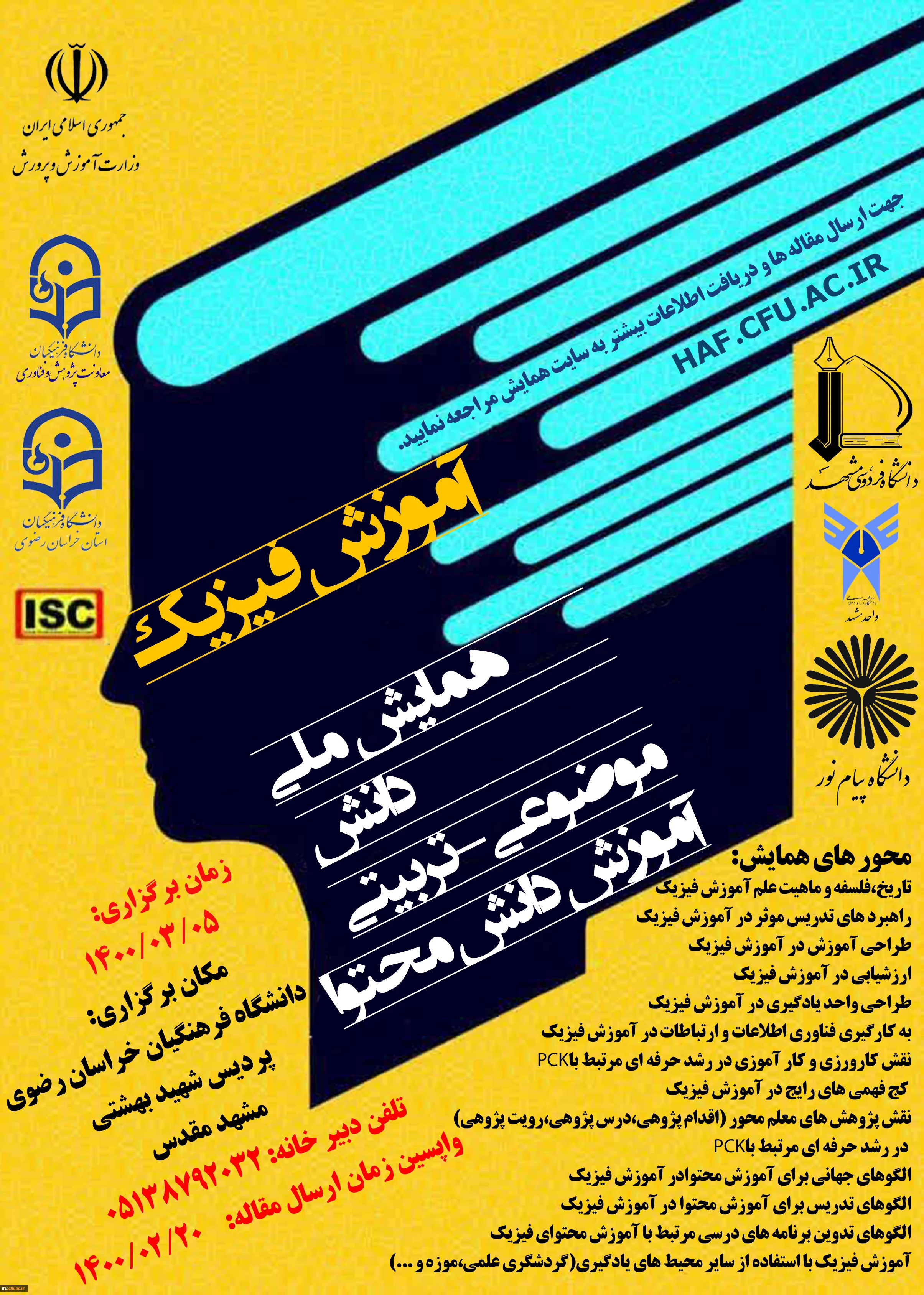 امتیاز دهید : همایش ملی(pck) آموزش فیزیک - دانشگاه فرهنگیان استان خراسان رضوی 2 شنبه 4 اردیبهشت 1400 ساعت 9:28