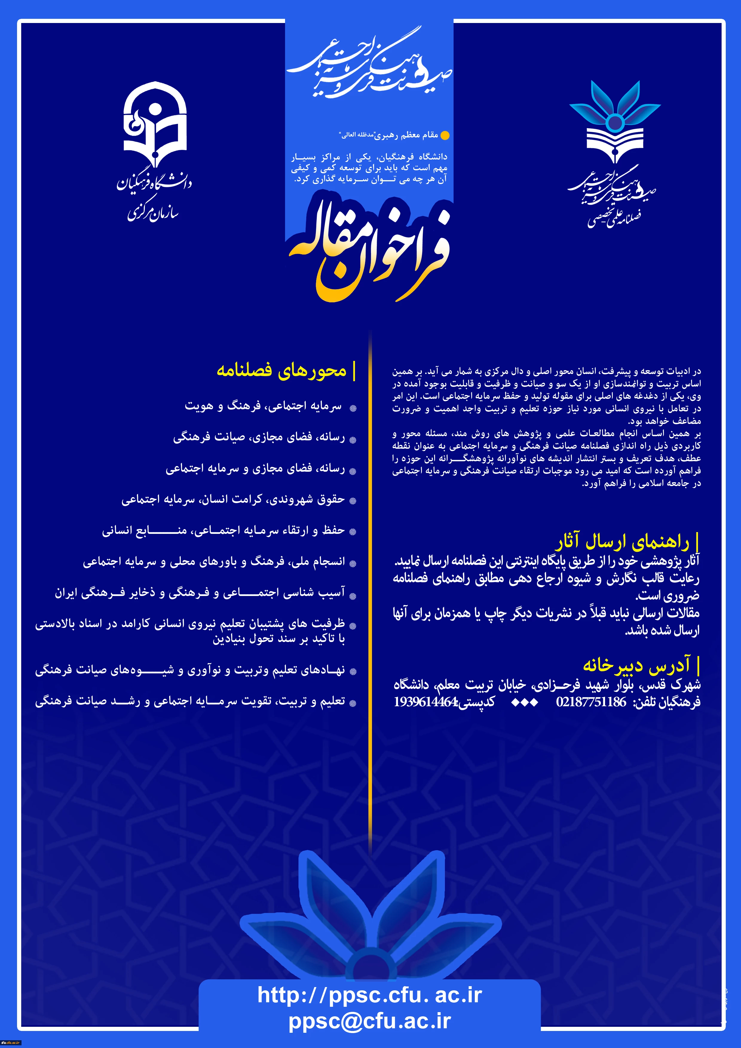 امتیاز دهید : فراخوان مقاله فصلنامه علمی تخصصی صیانت فرهنگی و سرمایه اجتماعی 2 شنبه 4 اردیبهشت 1400 ساعت 9:47