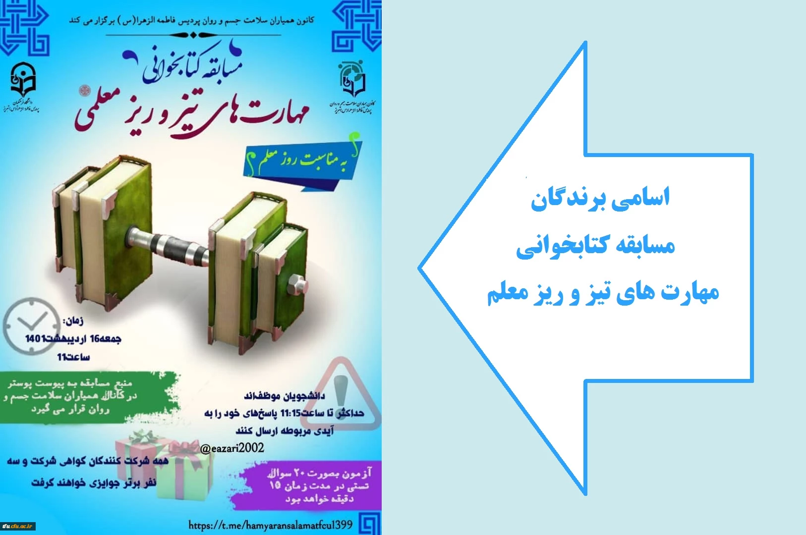 امتیاز دهید : اسامی برندگان مسابقه کتابخوانی مهارت های تیز و ریز معلمی 2 شنبه 24 اردیبهشت 1401 ساعت 10:02