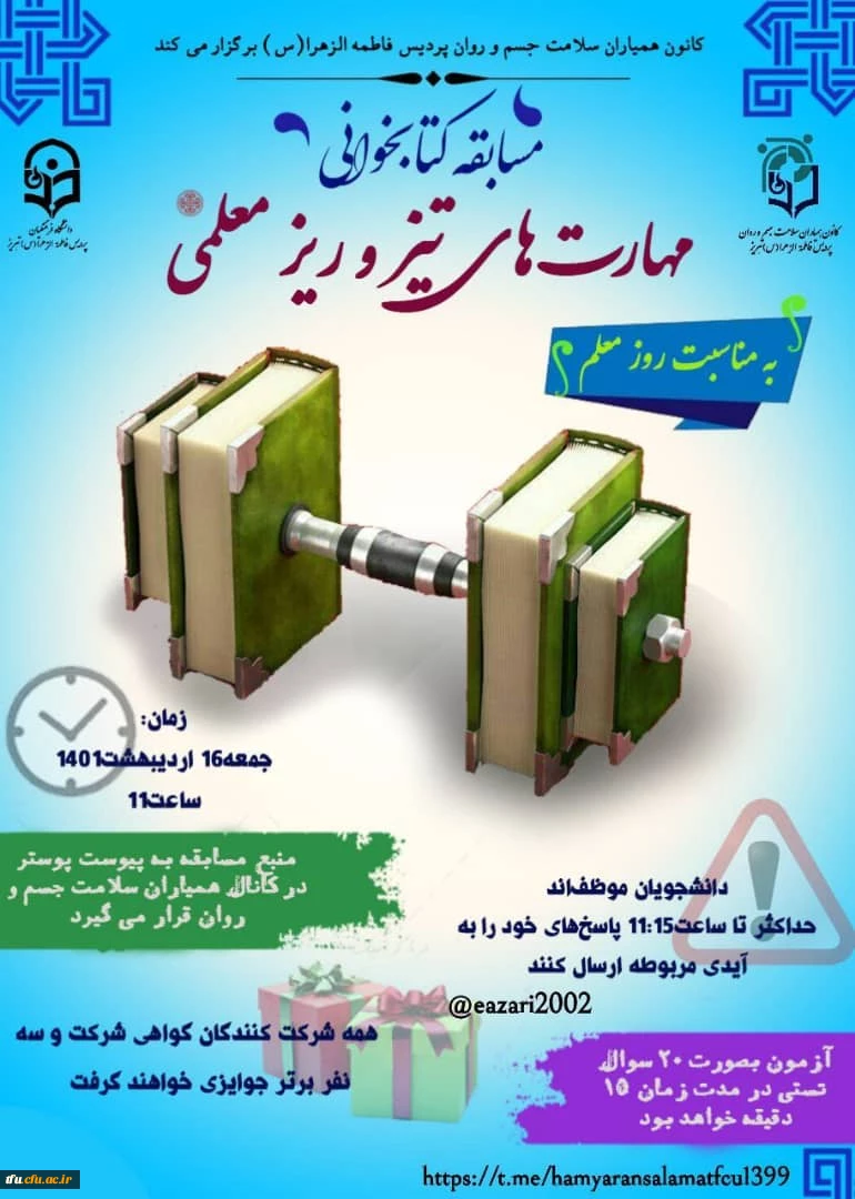 امتیاز دهید : اسامی برندگان مسابقه کتابخوانی مهارت های تیز و ریز معلمی 3 شنبه 24 اردیبهشت 1401 ساعت 10:02