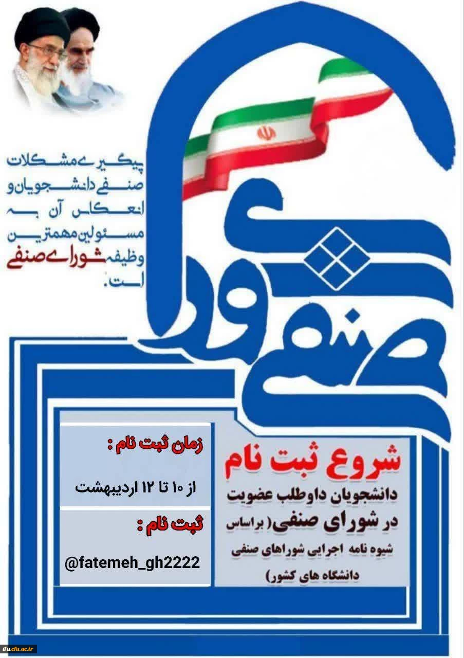 امتیاز دهید : ثبت نام انتخابات شورای صنفی و رفاهی پردیس فاطمه الزهرا (س) 2 چهارشنبه 12 اردیبهشت 1403 ساعت 8:32
