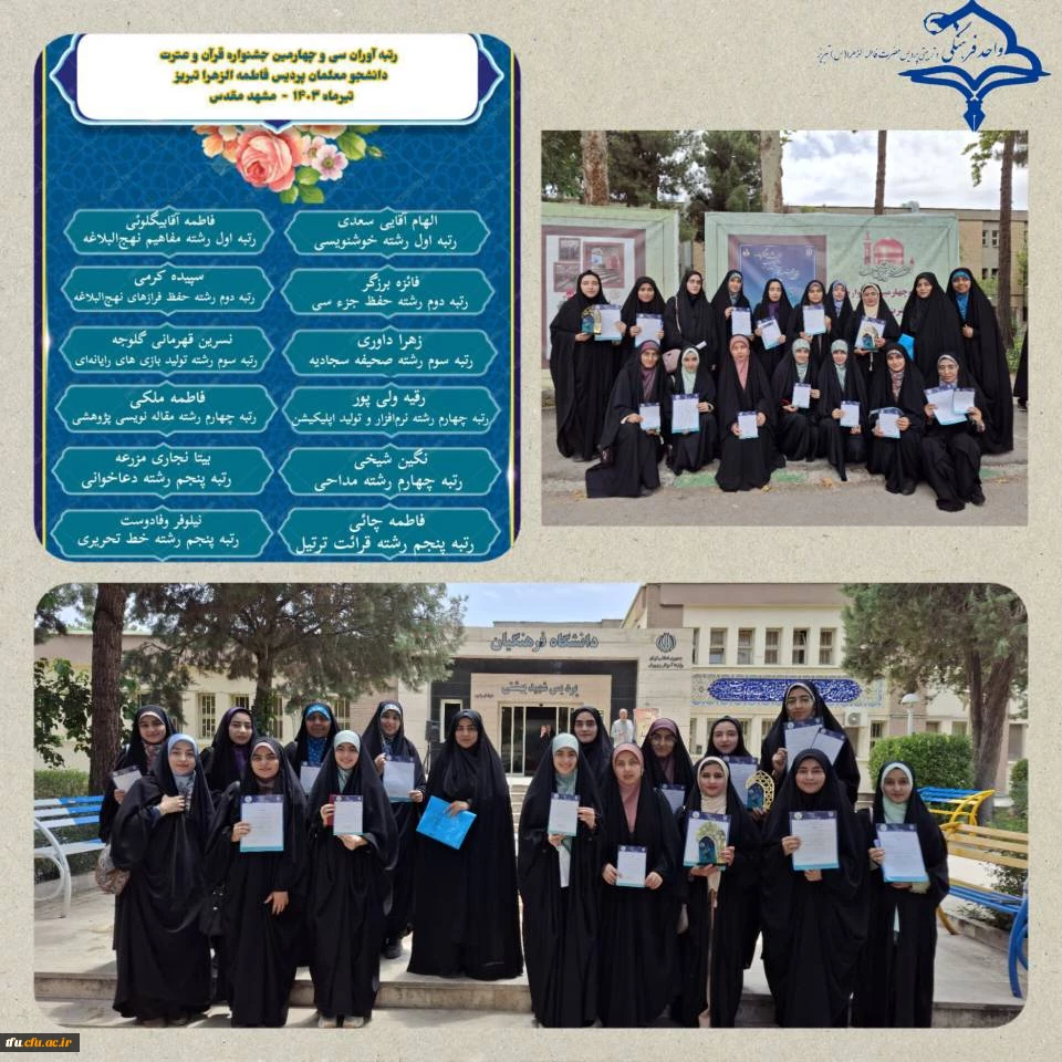 رخشش و کسب رتبه های برتر توسط دانشجومعلمان پردیس حضرت فاطمه الزهرا (س) تبریز در مرحله کشوری سی و چهارمین جشنواره قرآن و عترت 2