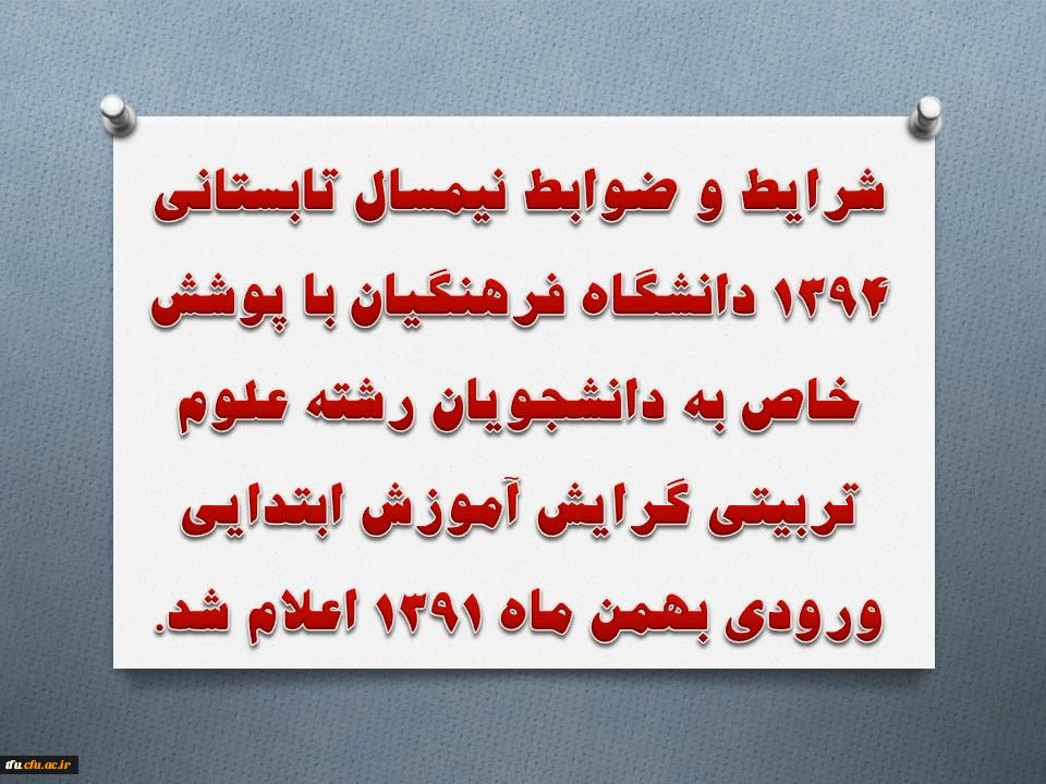 امتیاز دهید : شرایط و ضوابط نیمسال تابستانی 1394 دانشگاه فرهنگیان اعلام شد. 2 دوشنبه 22 تیر 1394 ساعت 12:14