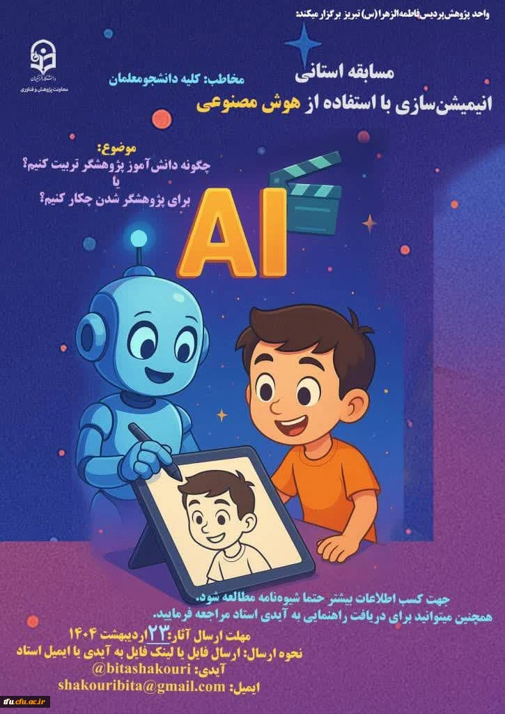 امتیاز دهید : برگزاری مسابقه انیمیشن سازی در پردیس فاطمه الزهرا(س) 2 یکشنبه 28 اردیبهشت 1404 ساعت 6:49